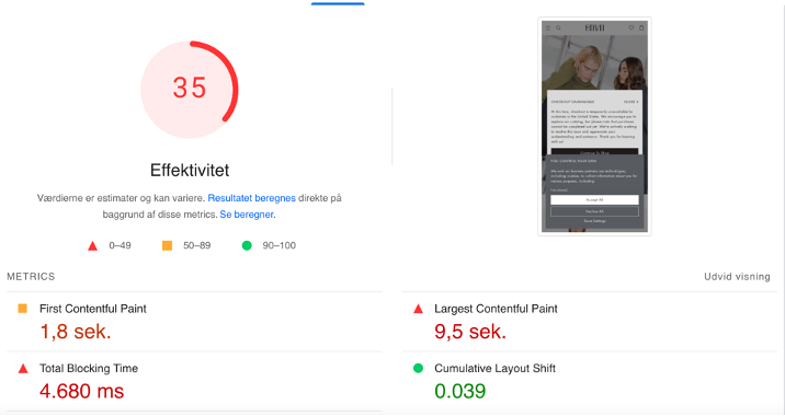 Hjemmesiden for Envii på mobil er langsom til at indlæse hovedindholdet, hvilket resulterer i en lav effektivitetsscore, primært på grund af en høj Largest Contentful Paint (LCP). Denne måler, hvor lang tid det tager for det største indhold på siden at blive synligt. Desuden er Total Blocking Time (TBT) høj, hvilket forsinker, hvornår brugerne kan interagere med siden efter indholdet, er indlæst. LCP er sandsynligvis langsom, da shoppesites som Envii ofte har mange billeder, der skal indlæses, hvilket kan resultere i op til 9,5 sekunders indlæsningstid.