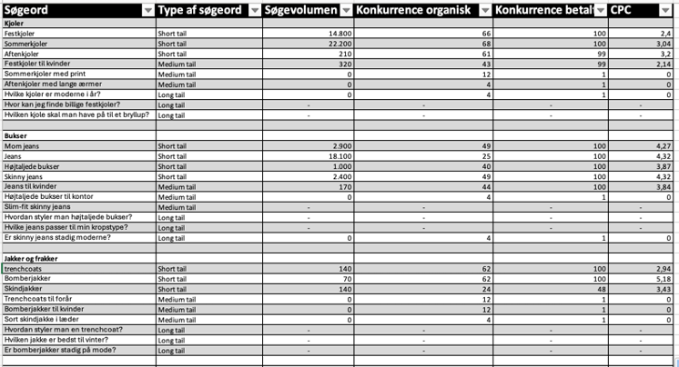 Mens short-tail søgeord som “Sommerkjoler” og “Jeans” tiltrækker meget trafik, vil en målrettet strategi, der kombinerer disse med long-tail søgeord, kunne give bedre resultater på længere sigt. Long-tail søgeord har mindre konkurrence og kan tiltrække mere kvalificeret trafik med en højere sandsynlighed for konvertering.